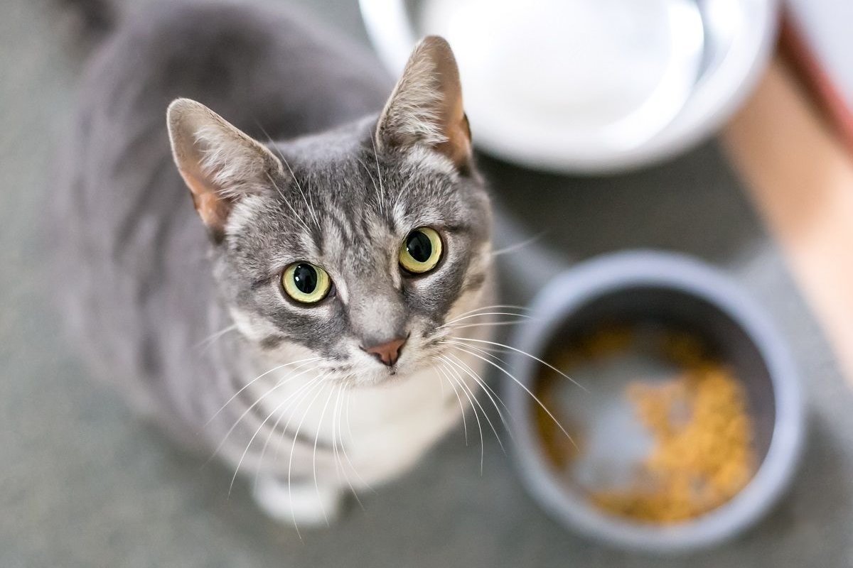 Un gato atigrado gris de pelo corto sentado junto a su plato de comida y mirando a la cámara.